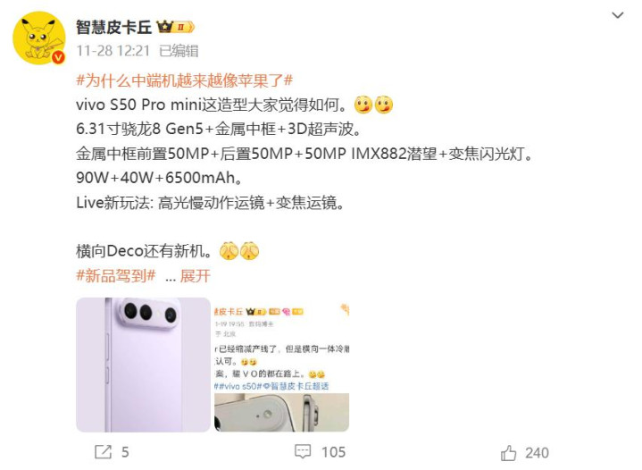 接下来vivo还会有一部骁龙8Gen 5处理器的手机,是小屏设计的s50 pro mini,这款手机的定位会高一些,虽然同样是骁龙8Gen 5手机,但在影像方面会更强,因此定价应该是在三千元档,会在本月上市,本期就来盘点盘点这些新机,朋友们可以了解下。