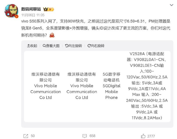 vivo s50系列早就入网了,只是发布时间比同档手机略晚一些,因为要等一加首发采用骁龙8Gen 5处理器,不过过几天就能看到了,全系采用6.59英寸+6.31英寸的双尺寸,高配版本是6.31英寸小屏设计。