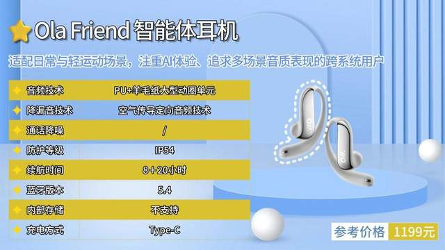 总结:OlaFriend以豆包大模型语音交互、双系统兼容与舒适佩戴为核心优势,音频表现全面、降噪实用且续航扎实。整体适配日常与轻运动场景,特别适合注重AI体验、追求多场景音质表现的跨系统用户。
