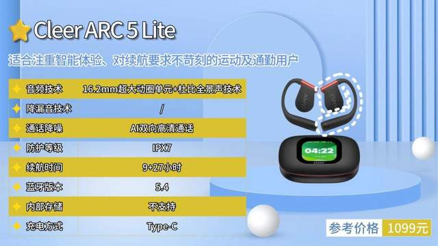 CleerARC5Lite是主打智能交互与沉浸音质的耳挂式开放式耳机,以16.2mm动圈单元、杜比全景声与AI环境音调节为核心亮点,是注重智能体验与实用性能用户的优质选择。