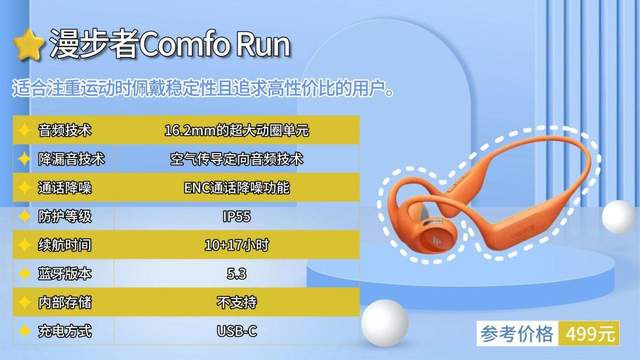 漫步者ComfoRun是一款主打运动场景的后挂式开放式耳机,兼顾实用性与性价比,堪称运动党的优选之选。
