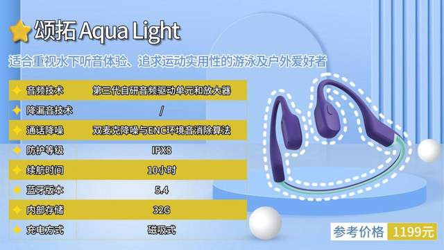 颂拓AquaLight是专为游泳及户外运动打造的骨传导耳机,搭配自研骨传导技术与轻量化设计,精准适配水上运动及日常训练场景,是注重安全聆听与实用性能的运动者优选。