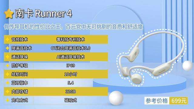总结:南卡Runner4以品牌技术底蕴为支撑,在音质、佩戴、防护与续航四大维度均表现出色,堪称“百元级运动耳机标杆”。对于追求实用性能与预算控制的用户而言,是一款闭眼入手也不踩坑的诚意之作,真正实现科技为运动生活赋能。