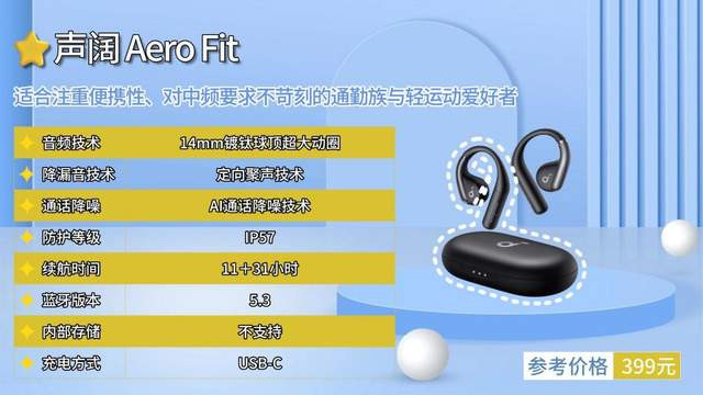 总结:声阔AeroFit以轻量化佩戴、扎实防护与长续航为核心竞争力,叠加定向聚声防漏音与AI通话降噪技术,音频表现更趋完善。适合注重便携性、对中频要求不苛刻的通勤族与轻运动爱好者。