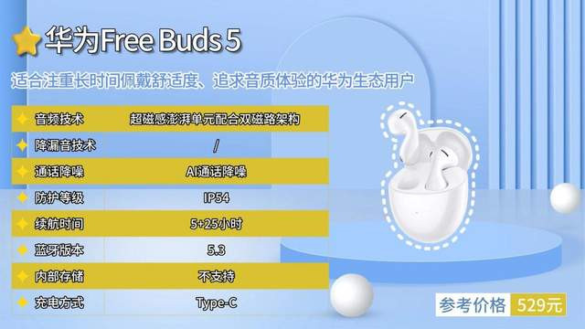 总结:华为FreeBuds5以舒适佩戴、高清音质与生态适配为核心竞争力。整体表现贴合日常使用需求,特别适合注重长时间佩戴舒适度、追求音质体验的华为生态用户,轻运动与通勤场景适配性突出。