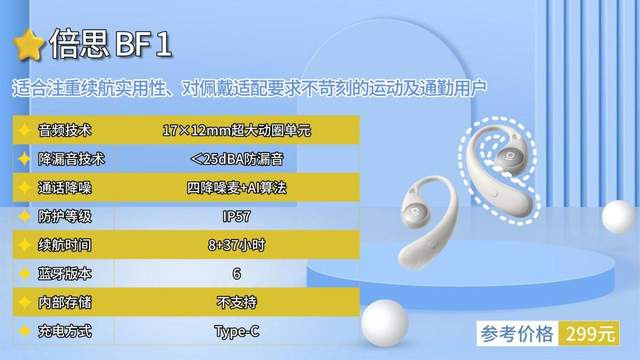 倍思BF1是主打高性价比的耳挂式开放式耳机,239元定价兼顾音质与实用性,是注重长效使用用户的优质选择。